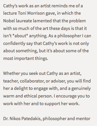 “I completed a Masters in painting in 2017. As a long time professional artist I attended Cathy’s ecoliteracy workshop in November 2019. I was not sure what to expect but was hoping for high standards I was not disappointed. She had a well thought out plan. What I found most impressive apart from her intellectual modesty and approachability, was the generosity with which she shared her concerns and interests. The quality and delivery of the information she imparted on the general field of ecoart research was very useful and an inspiration. A great educator and super mentor. I look forward to her forthcoming online course.”