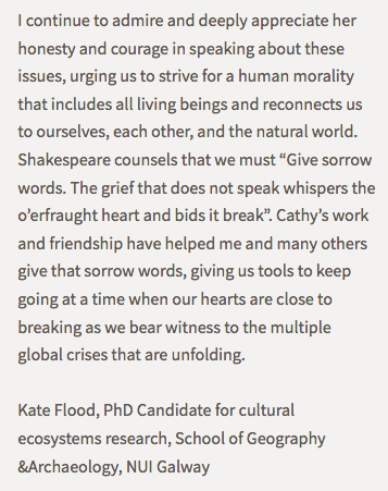 I also wish to thank Carlow Arts Officer Sinead Dowling for her support. A Carlow Arts Office Award enabled me to develop my successful pilot Live Essential Ecoliteracy Course in November 2019