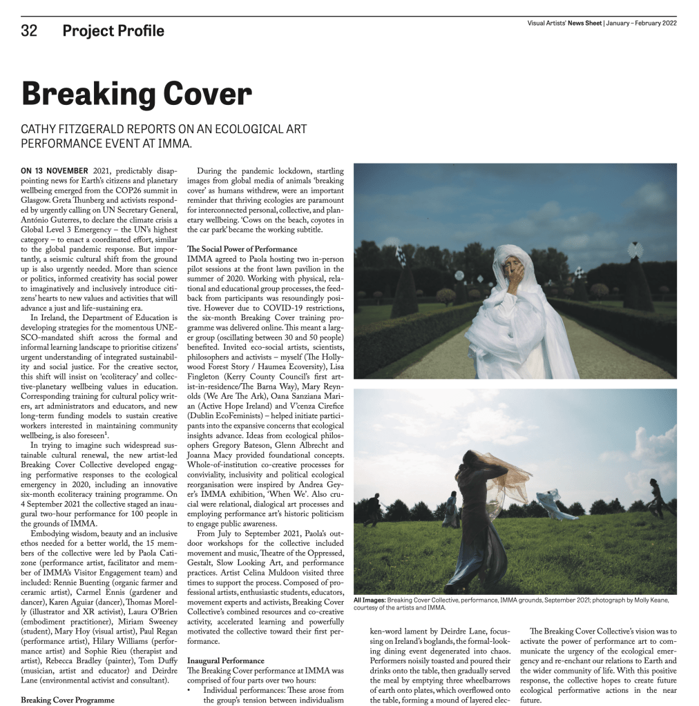 For the first 2022 edition of the Visual Artists Ireland Newsheet I was delighted to review a significant artist-led ecosocial creative, the 2020-2021 Breaking Cover programme and public performance by the new Breaking Cover Collective which was hosted and supported by the Irish Museum of Modern Art (IMMA).