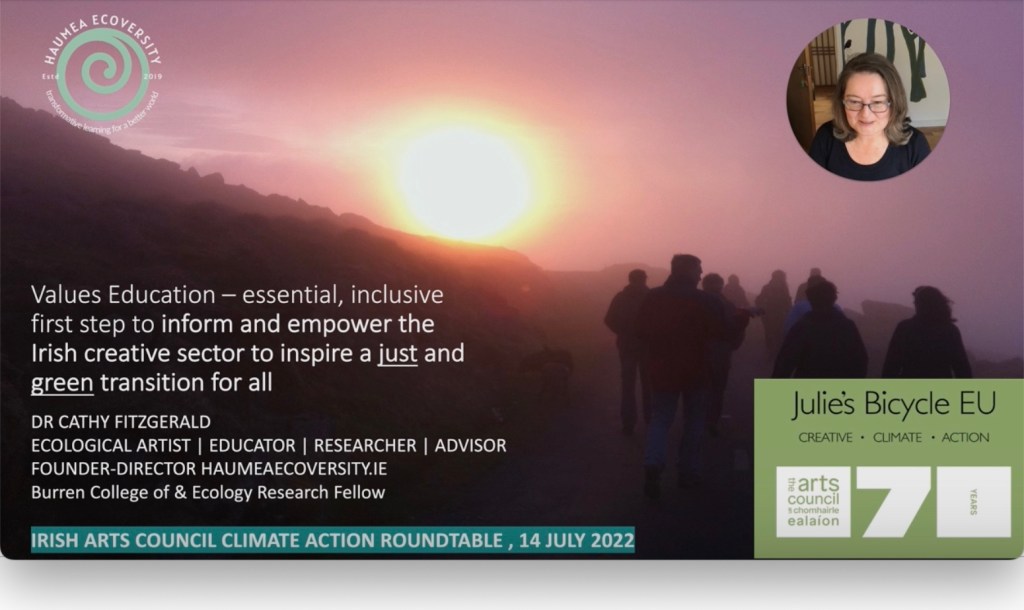 I was excited this week to present at the Irish Art Council and Julies’ Bicycle EU Climate Action Policy Roundtable discussions by and for the Irish creative sector. In wide-ranging discussions about ‘Arts Council funding as a driver for climate action, capacity-building and support for the creative sector, for unlocking leadership and innovation’ and general conversations about what might policy for the sector might include – I was proud to share findings from Haumea Ecoversity Earth Charter learners work.