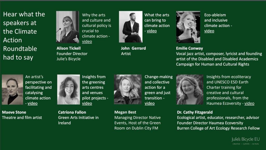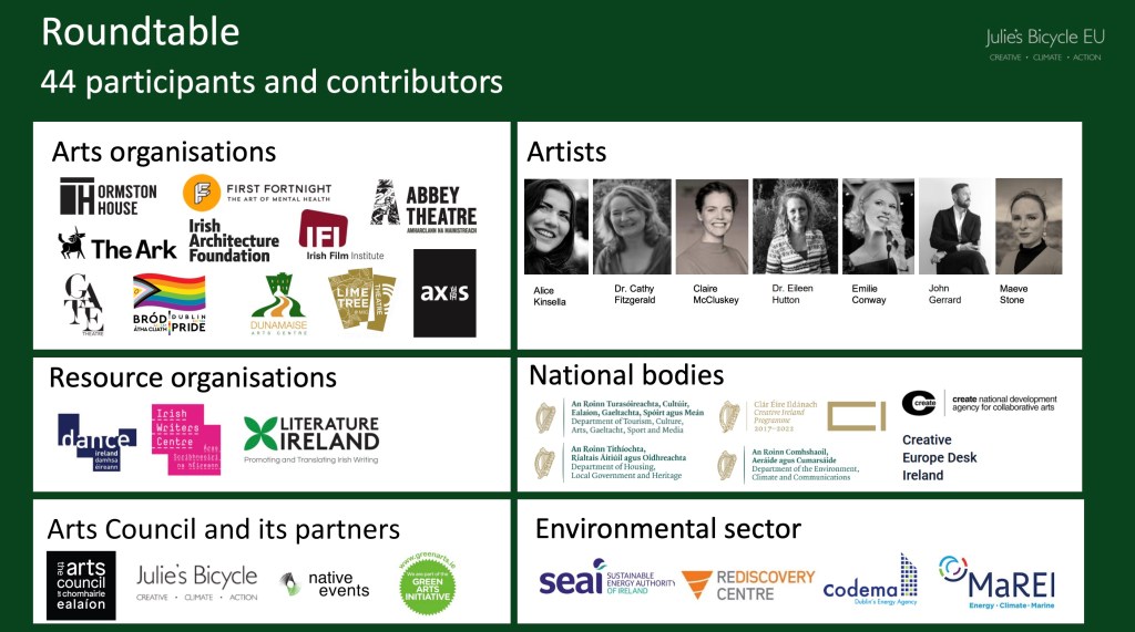 ‘For the past six months, The Arts Council has been working with our partners Julie’s Bicycle EU to undertake an in-depth consultation process with artists, arts organisations, arts workers and wider stakeholders to inform the development of its Climate Action Policy. This consultation process included an industry wide survey, internal and external interviews and a roundtable event.