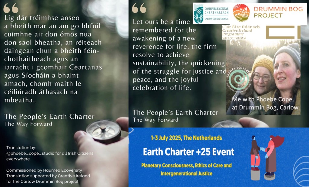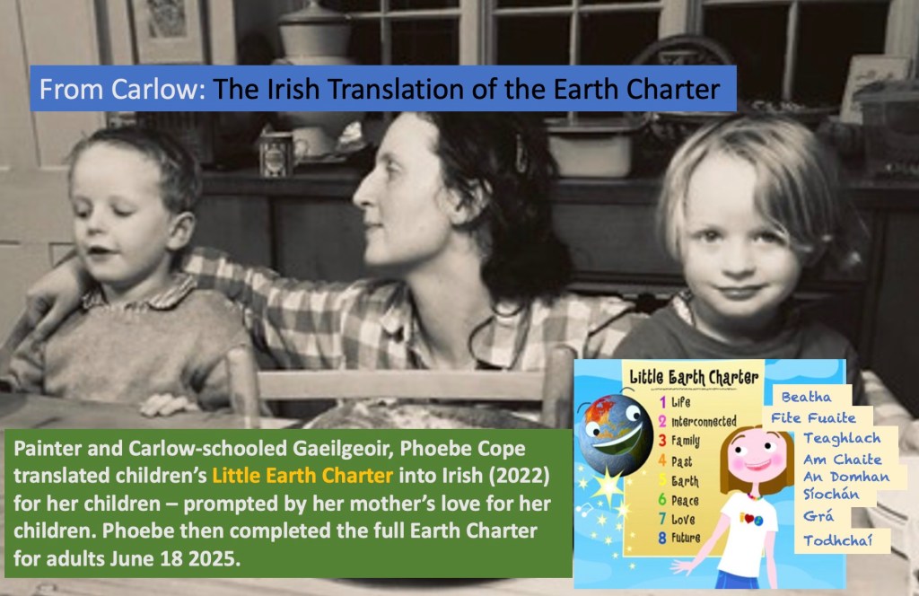 Much gratitude to artist and Gaeilgeoir Phoebe Cope for work since 2022 in translating the full version, the Children’s 8-word Little Earth Charter and Song into Irish and then the 8-page Earth Charter (for adults)