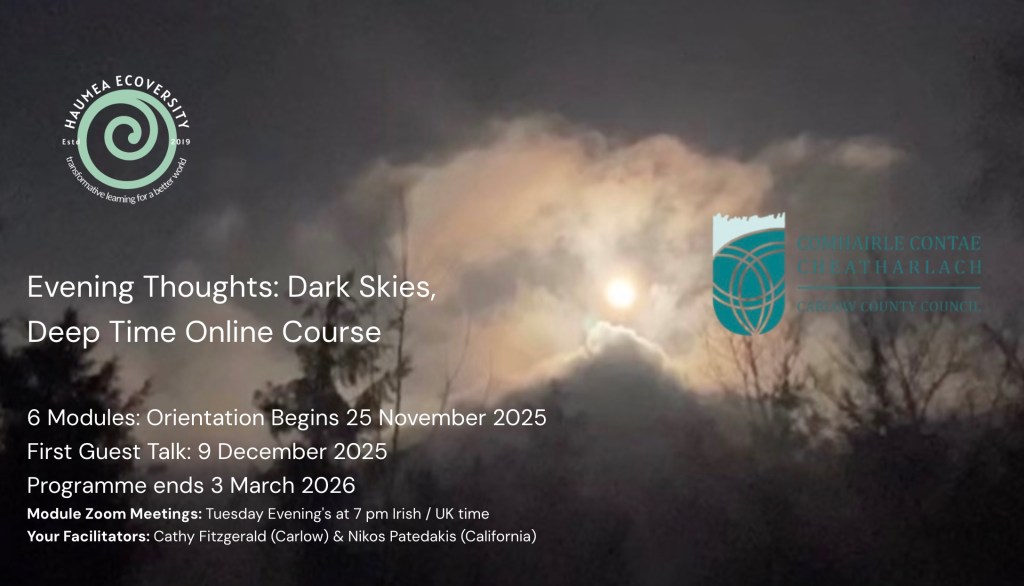 Irish and international speakers, Dr Niamh Brennan, SETU, US eco-poet and Revd. Dr Martin Luther King ecological scholar, Dr Drew Dellinger, US Visiting Professor Author K. Lauren de Boer, UK Co-Founder of International Deep Time Walk, Robert Woodford, Aiobhin Ryan of Leave No Trace Ireland and Bauhaus short-listed eco-community Co. Waterford architect Philip Ryan, will share how a science-based cosmology, ecoliterate creative practice and nighttime outdoor experiences inspire wonder, gratitude and increase our responsibility to care for nature and precious habitats.