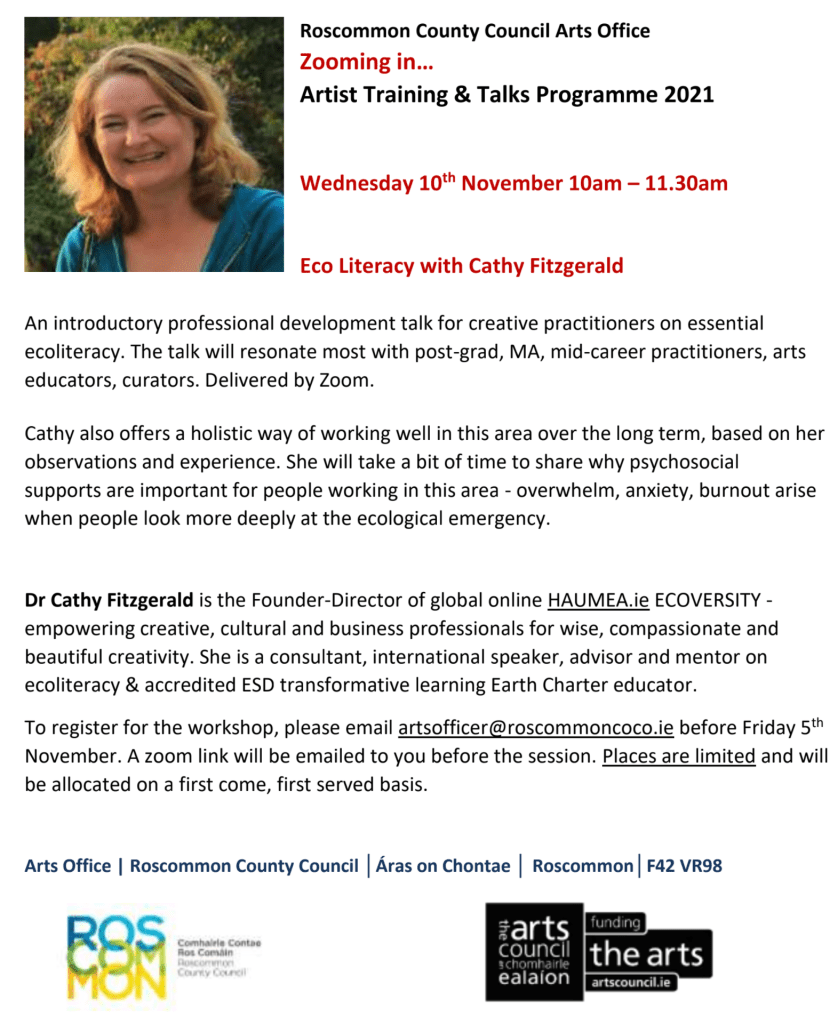 2022: Leitrim Arts Office intro. to ecoliteracy webinar, Oct for sponsored arts office bursary