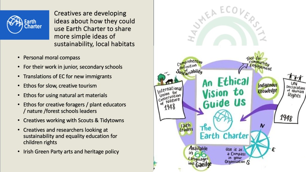 In July 2022, Cathy presented these insights at the Arts Council’s Roundtable Climate Policy meeting, advocating urgent, sector-wide fluency in holistic, value-driven systems thinking. However, awareness of the foundational need for values based learning, the many decades relevance of the Earth Charter to promote systems thinking is still at its early stages in Ireland.